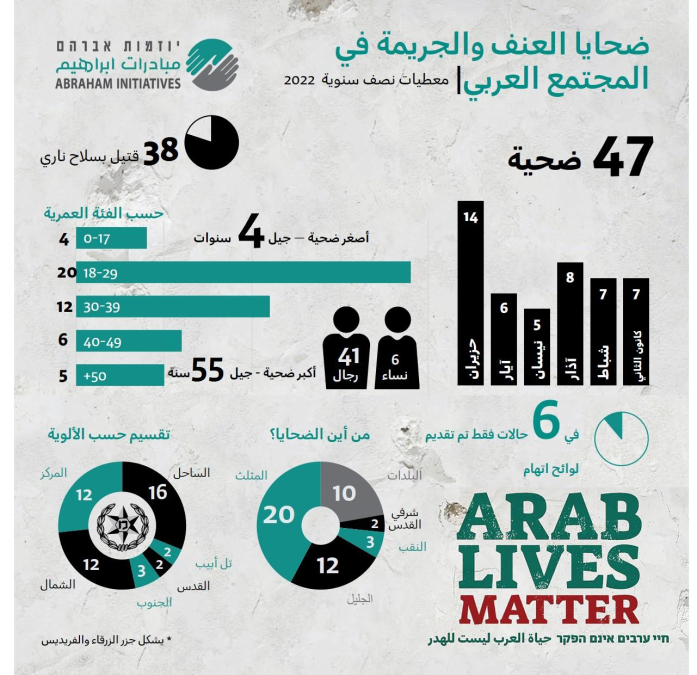 وجاء في بيان "ميادرات ابراهيم": "فقد 47 فلسطينيا من مواطني الدولة، حياتهم في ظروف تتعلق بالعنف والجريمة في النصف الأول من عام 2022. مقارنة بـ 52 ضحية في نفس الفترة من العام الماضي. تُظهر المعطيات التي أعدّتها جمعية مبادرات إبراهيم أنه منذ بداية العام وحتى نهاية شهر تموز 2022، غالبية الضحايا (62٪) تتراوح أعمارهم بين 30 عامًا أو أقل. وأصغر الضحايا هو عمار حجيرات البالغ من العمر 4 سنوات من بئر المكسور. في معظم الحالات (81٪) كان القتل بسلاح ناري. ومن بين الضحايا الـ 47 ، هناك 6 نساء".