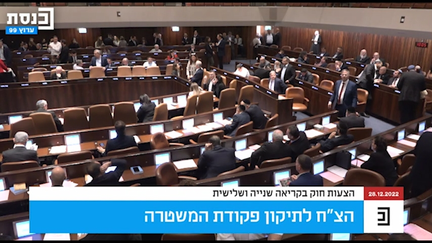 يقضيان بتعيين رئيس حزب "شاس"، "أرييه درعي" وزيرًا، بالرغم من إدانته بمخالفات فساد والحكم عليه بالسجن مع وقف التنفيذ، فيما يقضي التعديل الثاني بالسماح بتعيين وزير في وزارة الأمن الإسرائيلي بحيث يكون مسؤولًا عن "الإدارة المدنية" للاحتلال في الضفة الغربية، بناءً على طلب رئيس "الصهيونية الدينية"، "بتسلئيل سموتريتش".