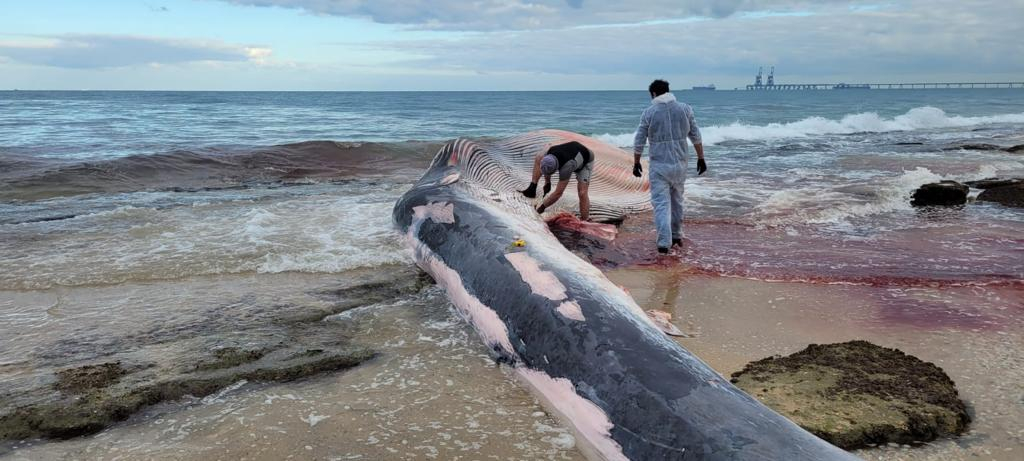 وتفيد تقارير أولية بأن الحوت قد مات في منطقة ما داخل البحر لاسباب مجهولة ومن ثم قذفته امواج البحر نحو الشاطئ.