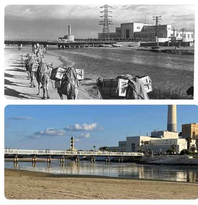 ويظهر في الصورة محطه توليد الكهرباء (الريدنك) بجانب مصب نهر العوجا بيافا لعام 1941، وبالمقابل تظهر صورة حديثة لمحطة توليد الكهرباء في تل ابيب لعام 2021.