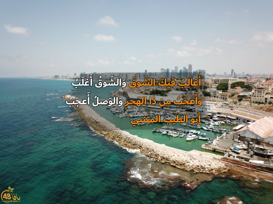 ما زال موقع يافا 48 مستمر معكم في نشر مختارات من أجمل القصائد، مع مقاطع جوية ساحرة لمدينة يافا، وهذه المرة نستمع لقصيدة "أُغالِبُ فيكَ الشَوقَ وَالشَوقُ أَغلَبُ" للشاعر أبو الطيب المتنبي والتي يقول فيها :