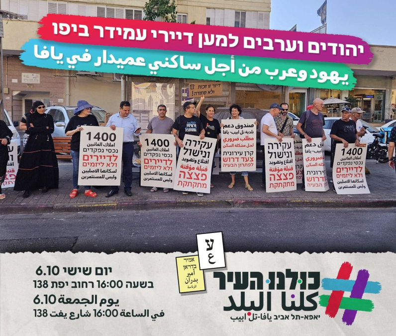 دعت قائمة كلنا البلد برئاسة المحامي أمير بدران الأهالي في مدينة يافا الى أوسع مشاركة في الوقفة الاحتجاجية التي ستقام اليوم في تمام الساعة ال 4 عصراً في شارع ييفت 138وذلك احتجاجاً على أزمة السكن المتفاقمة في المدينة.