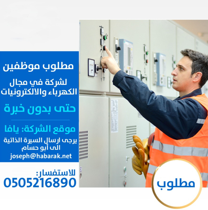 تُعلن احدى الشركات العاملة في مجال الكهرباء والالكترونيات في مدينة يافا، عن حاجتها لموظفين حتى بدون خبرة.
