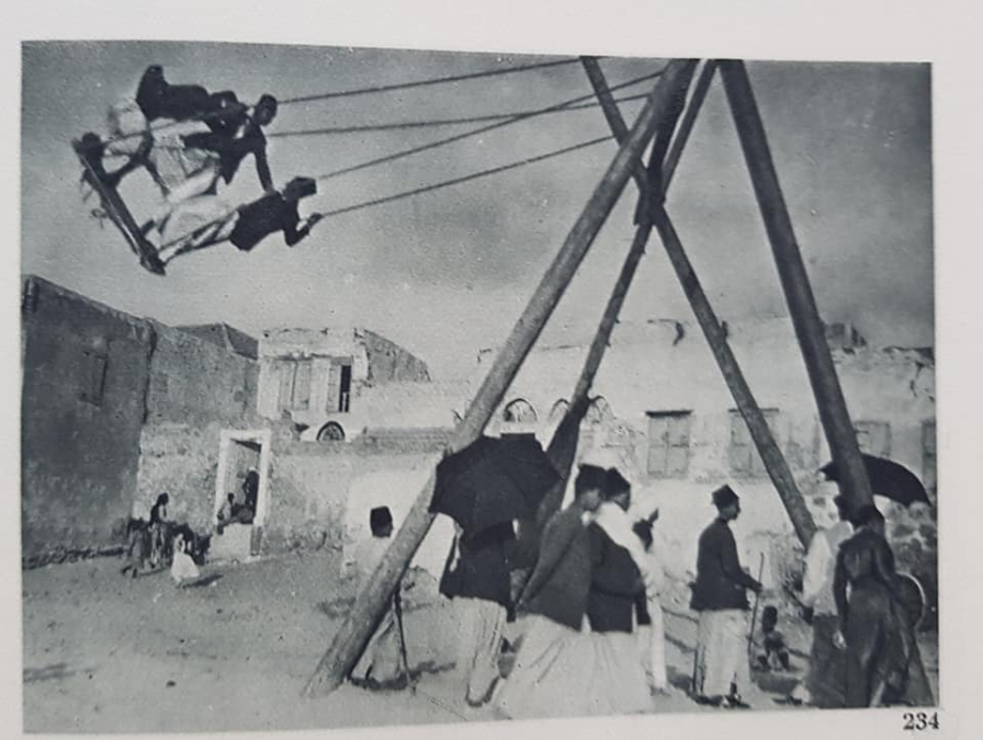 ويظهر في الصورة أجواء العيد في حي المنشية بمدينة يافا، وعدد من الأطفال الذين يلعبون ويلهون في العيد آنذاك.
