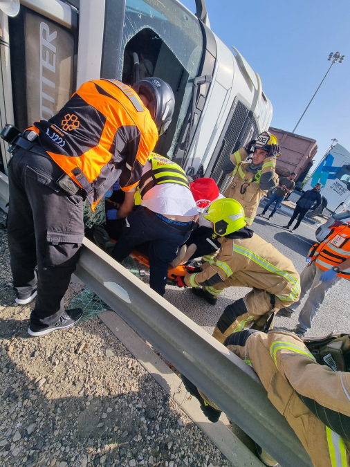انقاذ سائق شاحنة بعد انقلابها في مفرق اللد والرملة