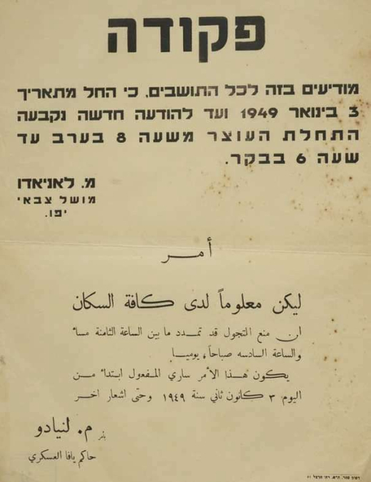 حصل موقع يافا 48 على صورة نادرة للأمر الذي أصدره حاكم يافا العسكري بعد النكبة عام 1948، والذي يعلن فيه منع التجول في المدينة بتاريخ 3 كانون الثاني "يناير" سنة 1949.