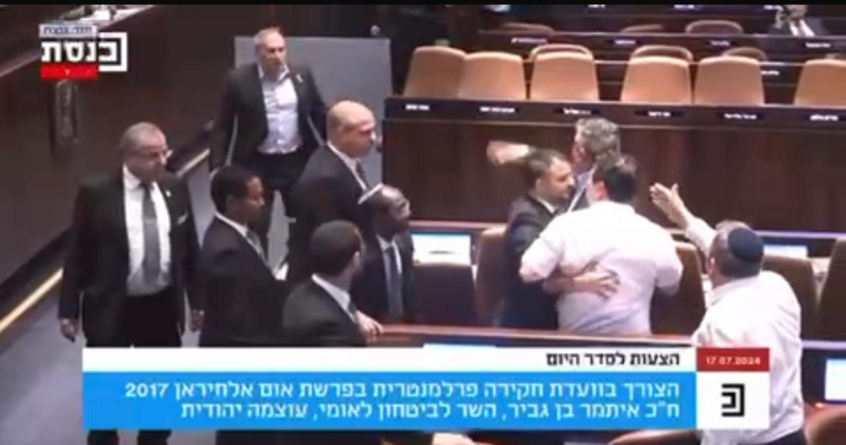 اعضاء الكنيست ، ايمن عودة ، يوسف العطاونة وأحمد الطيبي وآخرون اقتربوا من منصة الخطاب وبدأوا بالصراخ على الوزير بن غفير الذي واصل الاشارة اليهم بالخروج من القاعة. وفي هذه المرحلة، حضر حرس الكنيست واقترب كذلك عضو الكنيست حانوخ ميلافيتسكي من الليكود الذي تم ابعاده من قبل حراس الأمن عندما حاول الاقتراب من أعضاء الكنيست من الأحزاب العربية ومهاجمتهم في مشهد عنيف التقطته عدسات الكاميرات.