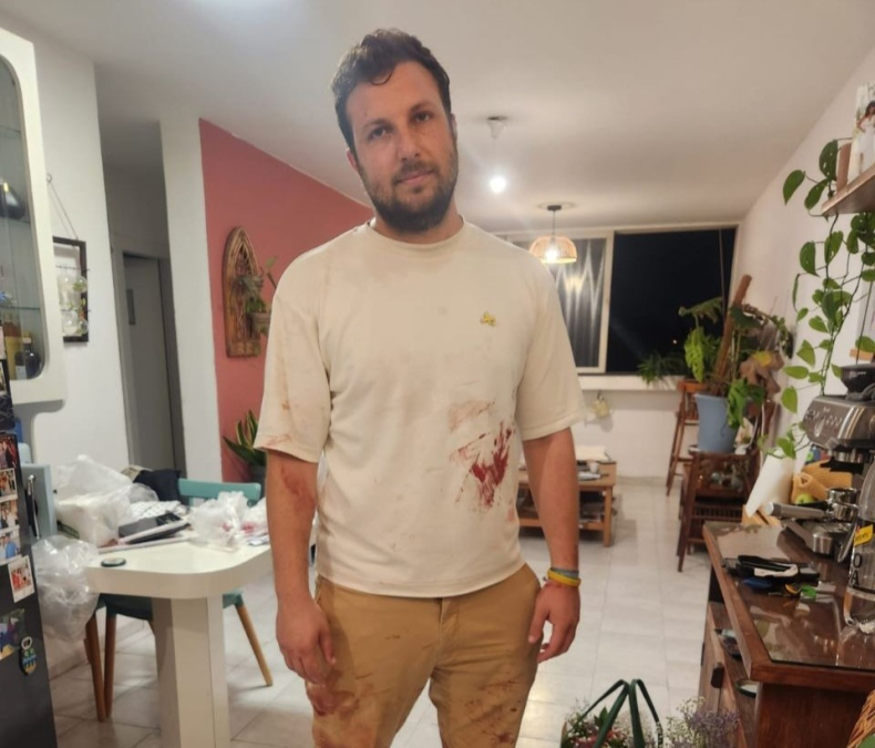 أنا وزوجتي ذهبنا إلى المنزل بسرعة، نحن نسكن على بعد خمس دقائق مشيًا من مكان العملية. عندما دخلنا إلى المبنى، تلقينا إشعارًا على هواتفنا من تطبيق قيادة الجبهة الداخلية للدخول فورًا إلى الأماكن المحمية. بعد دقيقتين كان هناك صفارة إنذار. ليس لدينا غرفة محمية، لذا نحن نحتمي في الدرج. كانت هناك عدة صفارات متتالية، وكل مرة خرجت إلى الدرج مع ملابس مغطاة بدماء الفتاة المصابة.