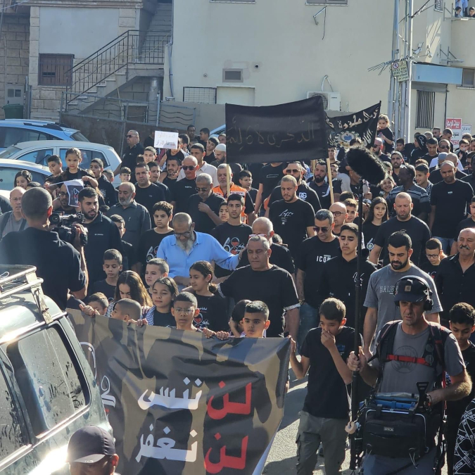 وارتدى المشاركون القمصان السوداء والتي كتب عليها "الذكرى الـ68 لمجزرة كفر قاسم، ثمانية وستون عامًا والجرح لا يزال نازف".