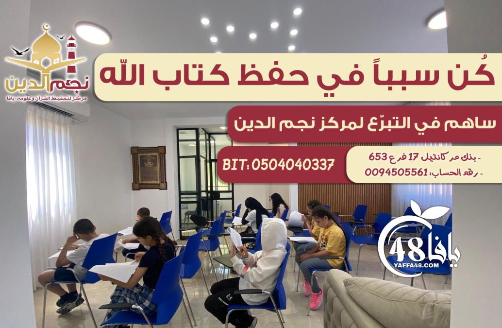 يدعو بهذا مركز نجم الدين لتحفيظ القرآن الكريم في مدينة يافا، الأهالي الى التبرّع ودعم المركز مادياً ليكمل المسيرة التي انطلقت في عام 2023، عبر تحفيظ أبناء مدينة يافا القرآن الكريم وتعاليم الدين الإسلامي، حيث يعتبر مشروع المركز صدقة جارية عن روح الشهيد محمد أبو نجم رحمه الله تعالى.