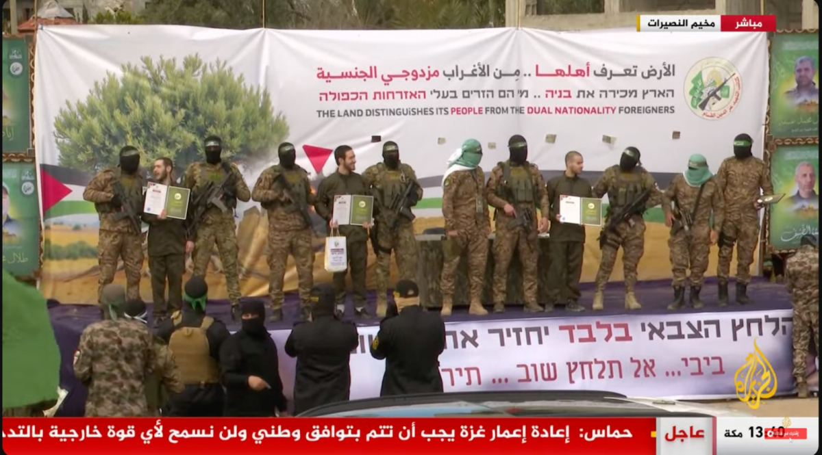 وانطلقت عملية تسليم 3 أسرى إسرائيليين في منطقة النصيرات وسط غزة، وذلك عقب عملية التسليم الأولى التي جرت قبل وقت قصير في رفح وشملت أسيرين إسرائيليين.