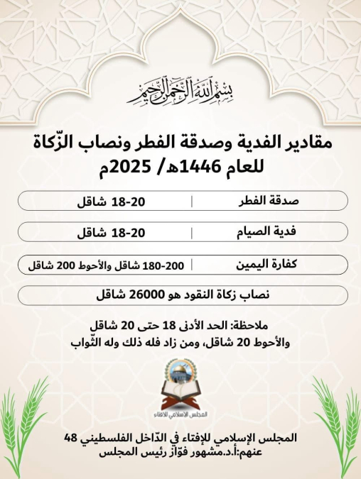 حدّد المجلس الإسلاميّ للإفتاء مقدار صدقة الفطر وفدية الصّيام ونصاب الزّكاة لشهر رمضان الموافق 1446 هـ - 2025 م؛ وذلك على النّحو الآتي:
