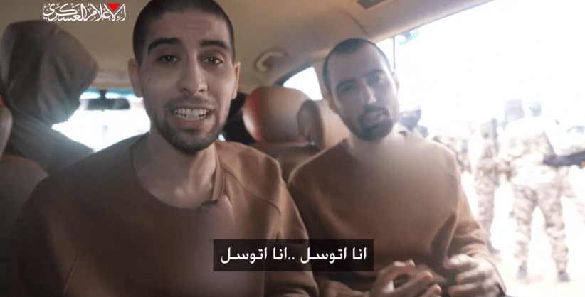 أحضرت حماس اثنين من المحتجزين الإسرائيلين، أفيتار دافيد وغاي جلبوع-دلال، اللذين لا يزالان في الأسر، لحضور مراسم الإفراج عن ثلاثة محتجزين إسرائيليين آخرين: عومر شم طوف، إليا كوهين، وعومر ونكرت في مخيم النصيرات وسط غزة.
