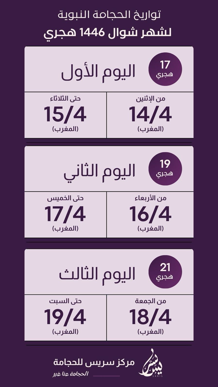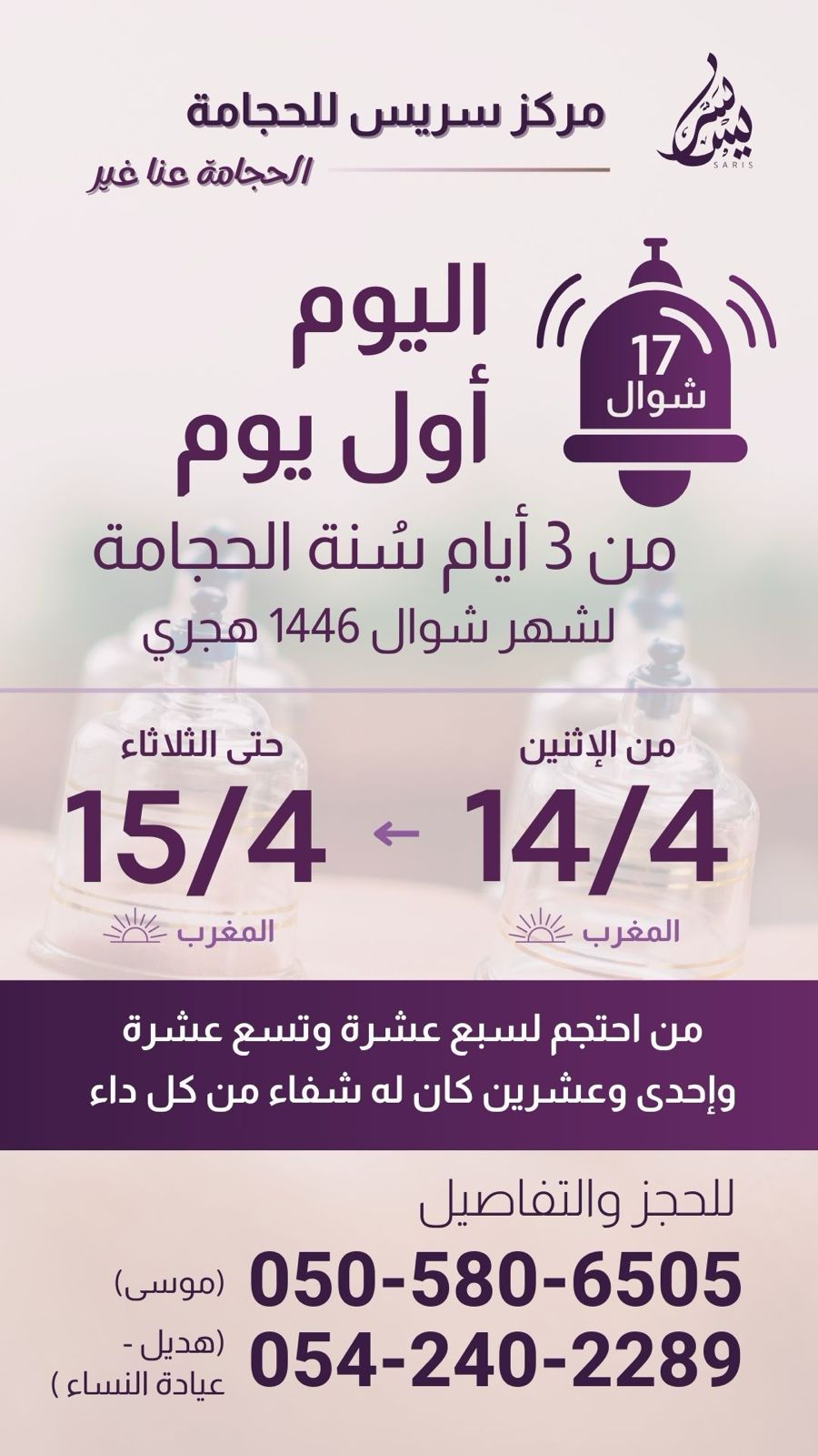 لا تفوت عليك الحجامه بافضل ايامها بالسنة النبوية وهي من افضل الايام للحجامه النبوية، وهذه الايام التي كان يحتجم بها النبي عليه افضل الصلاة والسلام احتجم لتنظف جسمك وتنظف دمك، حيث يصادف اليوم الاثنين 14.4.2025 بعد المغرب أول أيام الحجامة لهذا الشهر.