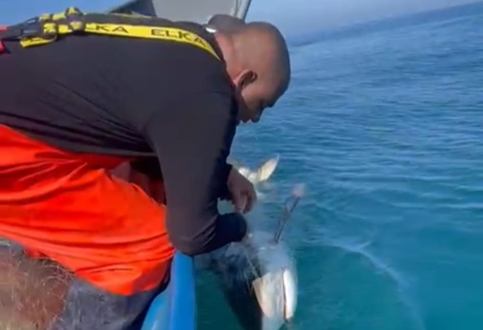 علقت سمكة قرش يبلغ طولها نحو 3 أمتار ويزيد وزنها عن 150 كيلوغرامًا في شباك الصياد اليافاوي المعروف زكريا ضعيف "أبو محمد"، خلال رحلة صيد اعتيادية قبالة شاطئ بات يام، جنوب مدينة يافا.
