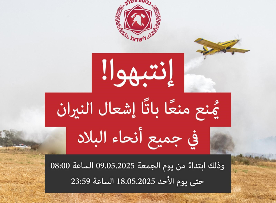 في أعقاب الأحوال الجوية الحارة والجافة التي تسود البلاد، أصدر قائد الإطفاء والإنقاذ، الجنرال إيال كاسبي، قرارًا بمنع إشعال النيران في جميع أنحاء البلاد. ويحظر هذا القرار إشعال النيران ابتداءً من اليوم (09.05.2025) وحتى تاريخ (18.05.2025) عند منتصف الليل.