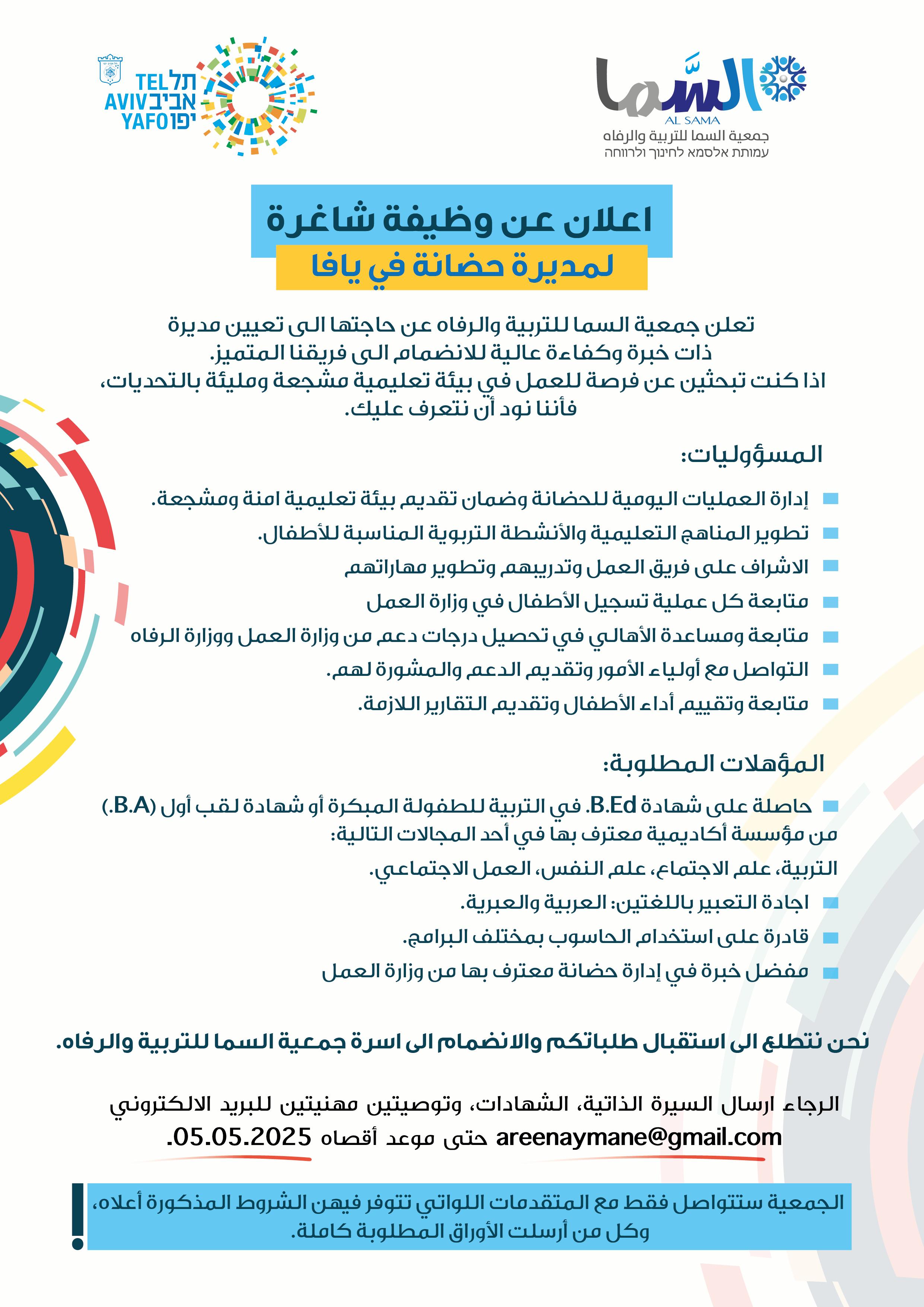 أعلنت جمعية "السما للتربية والرفاه" في مدينة يافا عن فتح باب التقديم لوظيفة مديرة حضانة، وذلك في إطار سعي الجمعية لتوسيع طاقمها المهني وتعزيز جودة الخدمات التربوية المقدّمة للأطفال.