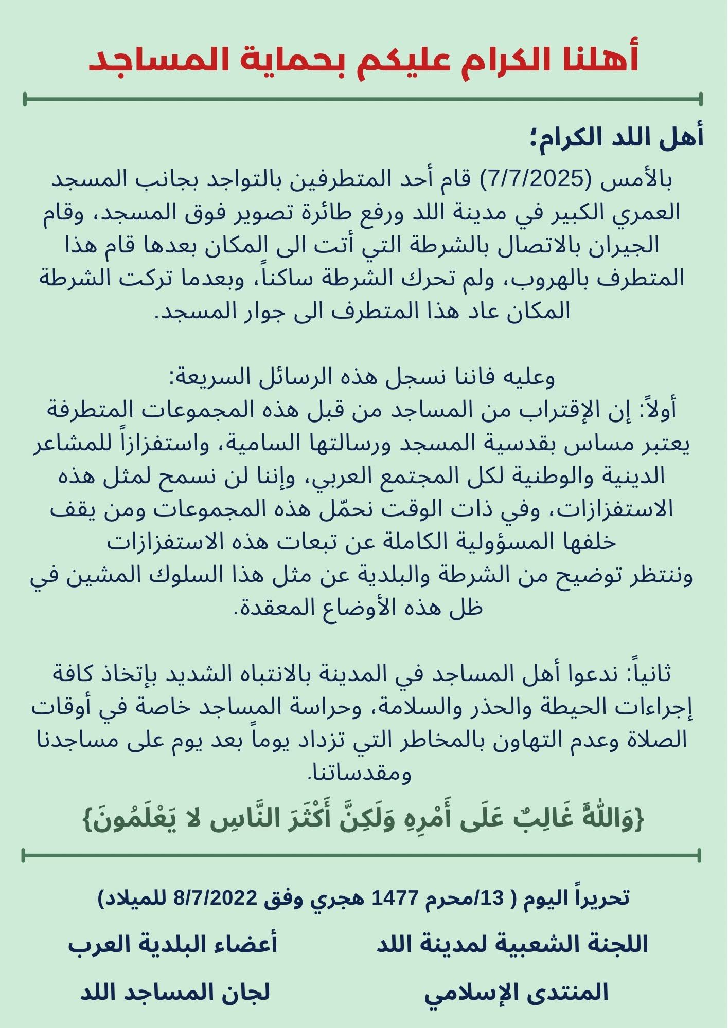 وجاء في البيان "بالأمس (7/7/2025) قام أحد المتطرفين بالتواجد بجانب المسجد العمري الكبير في مدينة اللد ورفع طائرة تصوير فوق المسجد، وقام الجيران بالاتصال بالشرطة التي أتت إلى المكان، بعدها قام هذا المتطرف بالهرب، ولم تتحرك الشرطة ساكنًا، وبعدما تركت الشرطة المكان عاد هذا المتطرف إلى جوار المسجد.