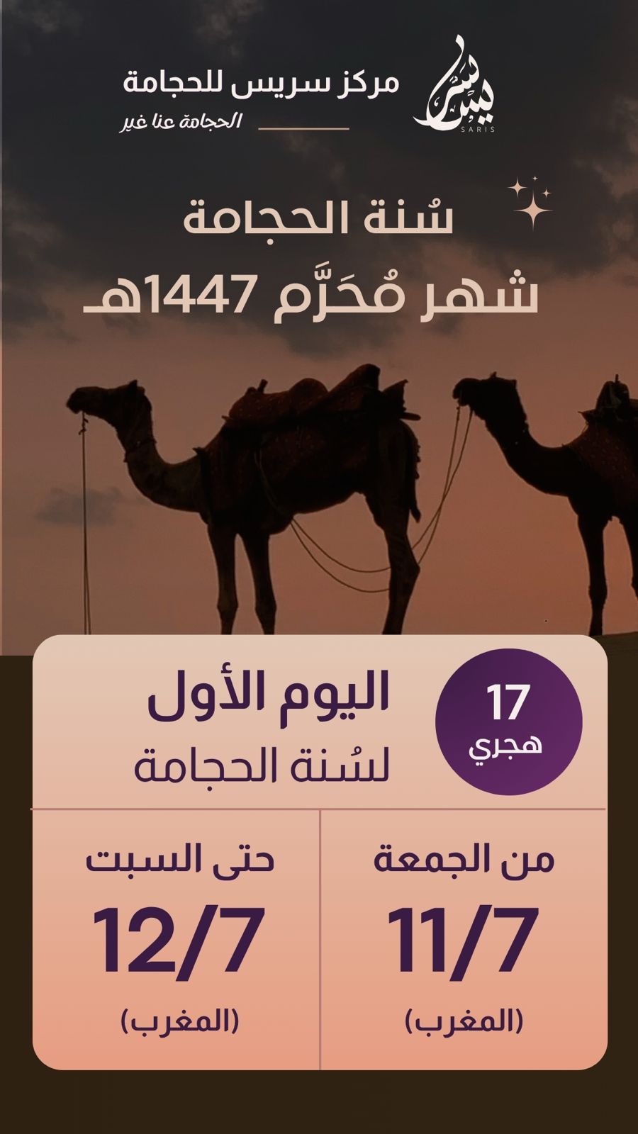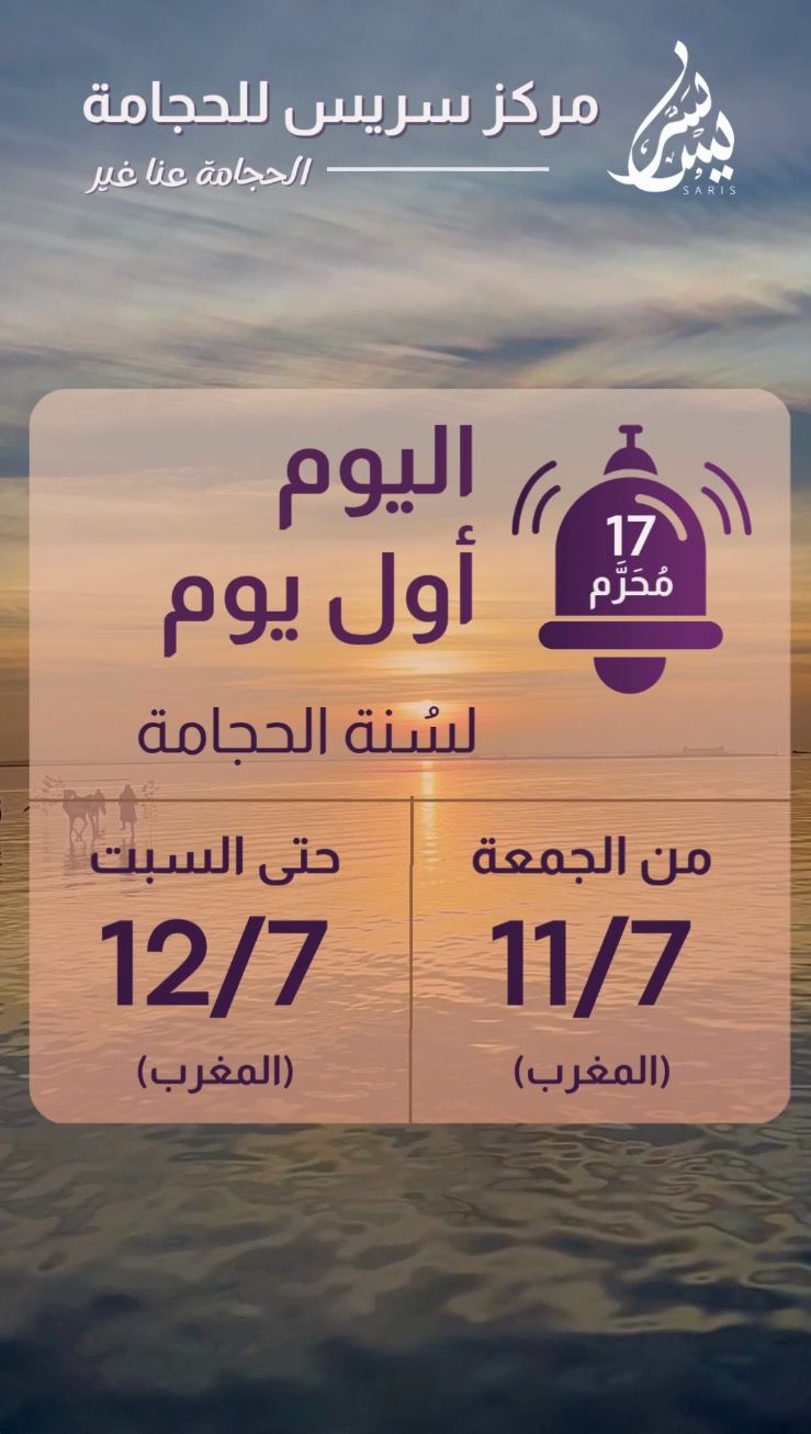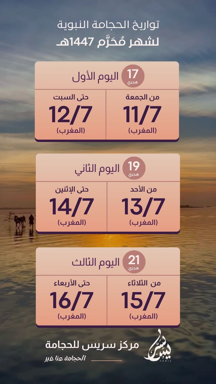 لا تفوت عليك الحجامه بافضل ايامها بالسنة النبوية وهي من افضل الايام للحجامه النبوية، وهذه الايام التي كان يحتجم بها النبي عليه افضل الصلاة والسلام احتجم لتنظف جسمك وتنظف دمك، حيث يصادف اليوم الجمعة 11.7.2025 بعد المغرب أول أيام الحجامة لهذا الشهر.