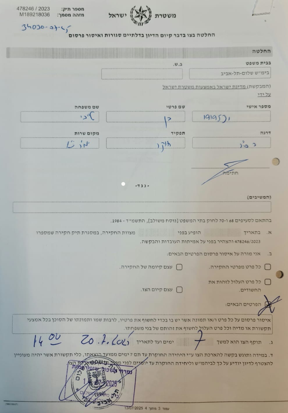وأصدرت محكمة الصلح في تل أبيب أمر حظر نشر في الملف رقم 478246/2023 يمنع نشر أي تفاصيل أو صور قد تكشف عن هوية العميل السري، بما في ذلك اسمه أو صورة أو معلومات عن عائلته، وذلك حتى 20.07.25.