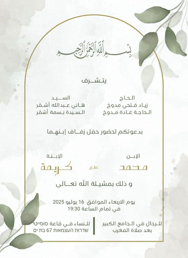 أعلنت عائلة مدوخ وعائلة أشقر أن حفل زفاف العريسين محمد زياد مدوخ وكريمة هاني أشقر سيُقام في موعده المحدد اليوم الأربعاء في تمام الساعة 19.30.