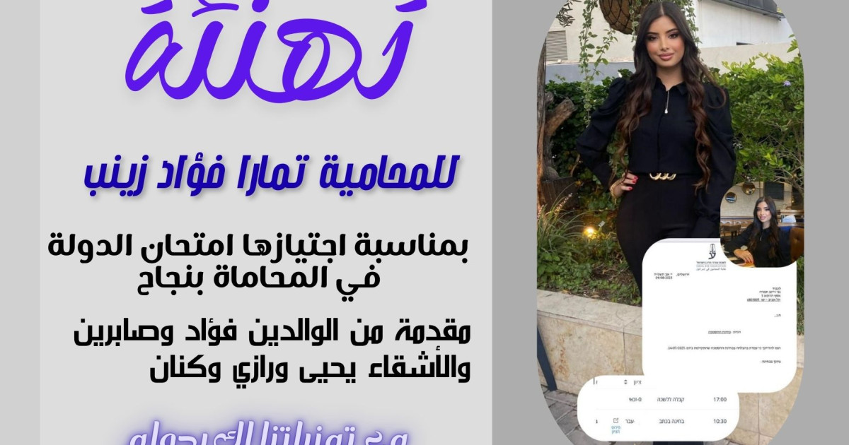 تتقدم عائلة زينب في مدينة يافا بأحر التهاني والتبريكات من ابنتهم المحامية تمارا فؤاد زينب بمناسبة اجتيازها امتحان الدولة "مزاولة المهنة" في المحاماة بنجاح واقتدار.