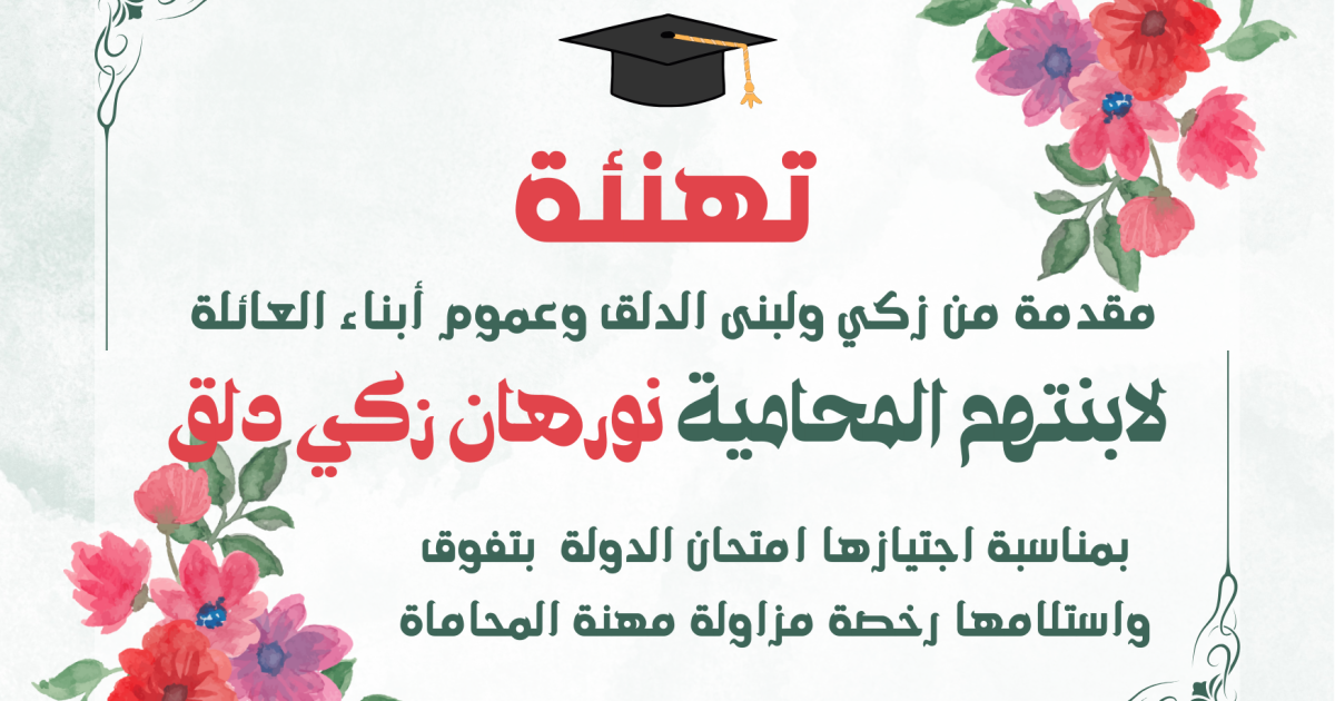 تتقدم عائلة الدلق في مدينة يافا بأحر التهاني والتبريكات من ابنتهم المحامية نورهان زكي دلق بمناسبة اجتيازها امتحان الدولة "مزاولة المهنة" في المحاماة بنجاح واقتدار، واستلامها رخصة مزاولة مهنة المحاماة.