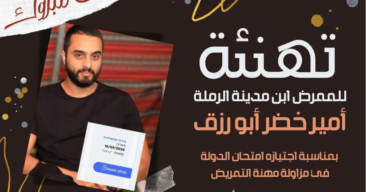 تتقدّم عائلة أبو رزق في مدينة الرملة بأحرّ التهاني والتبريكات لابنهم الممرّض أمير أبو رزق، بمناسبة نجاحه في امتحان الدولة لمزاولة مهنة التمريض. ويأتي هذا النجاح تتويجًا لسنواتٍ من الجدّ والاجتهاد، وبدايةً لمسيرة مهنية واعدة في ميدان التمريض الإنساني النبيل. التهنئة مقدّمة من الوالد خضر أبو رزق، الذي عبّر عن فخره واعتزازه بهذا الإنجاز، متمنّيًا لابنه مزيدًا من التوفيق والتميّز في حياته العملية والمستقبلية.
