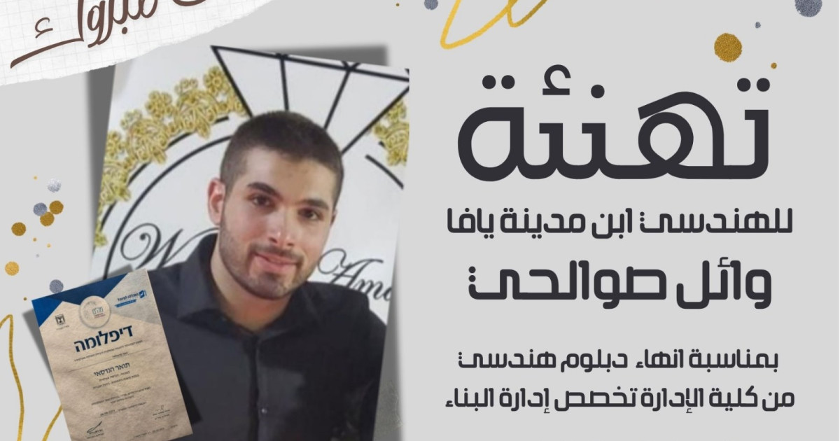تتقدّم عائلة صوالحي في مدينة يافا بأصدق التهاني وأحرّ التبريكات للهندسي وائل صوالحي بمناسبة إنهائه الدبلوم الهندسي من كلية الإدارة، تخصص إدارة بناء.