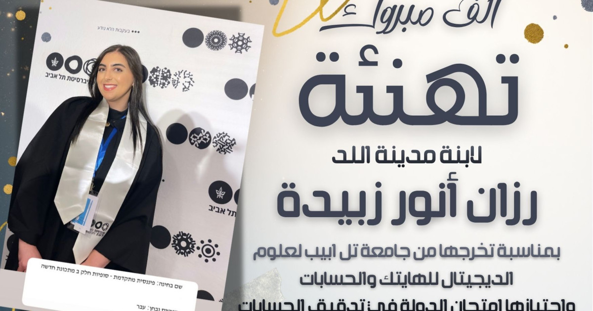 تتقدّم عائلة زبيدة في مدينة اللد بأحرّ التهاني والتبريكات إلى ابنتهم رزان أنور زبيدة، بمناسبة تخرّجها من جامعة تل أبيب بتخصص علوم الديجيتال للهايتك والحسابات بتفوّق، واجتيازها امتحان الدولة لمزاولة مهنة تدقيق الحسابات بنجاح.