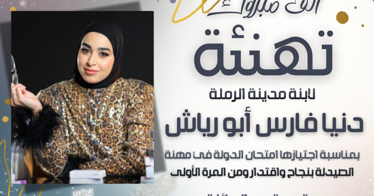 تتقدّم عائلة أبو رياش في مدينة الرملة وخارجها بأحرّ التهاني والتبريكات إلى ابنتهم الصيدلانية دنيا فارس أبو رياش، بمناسبة اجتيازها امتحان الدولة في مهنة الصيدلة بنجاح واقتدار ومن المرّة الأولى.