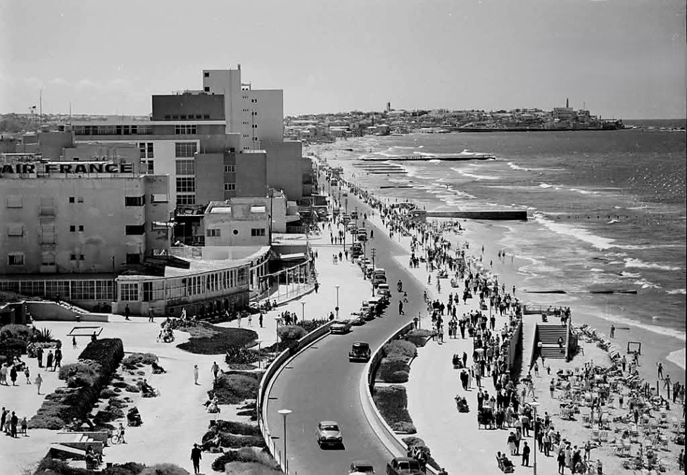 وتبرز في الصورة المباني الحديثة نسبياً لتلك الفترة، والفنادق والمؤسسات التجارية القريبة من الكورنيش، إضافة إلى التخطيط العمراني المتقدّم الذي ميّز حي المنشية، أحد أبرز أحياء يافا وأكثرها حيوية. وفي الخلفية، يلوح أفق المدينة ومبانيها الممتدة على الساحل، في لوحة تختصر مشهد الحضارة والرقي الذي عرفت به يافا.