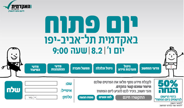 أعلنت الكلية الأكاديمية تل أبيب - يافا عن تنظيم يوم مفتوح يوم الجمعة القادم في تمام الساعة التاسعة صباحاً، حيث سيتم استقبال الطلبة الراغبين بالتسجيل وتعريفهم على الأقسام المختلفة في الكلية، بالاضافة إلى منحهم تخفيض يصل إلى 50% لمن يلتحق بالكلية خلال اليوم المفتوح.