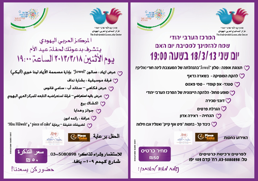 وصل موقع يافا 48 دعوة صادرة عن المركز الجماهيري في يافا من خلالها يدعو الأهالي للمشاركة في حفلة عيد الأم والتي ستقام يوم الاثنين 18-3-2013 في تمام الساعة السابعة مساءً في قاعة المركز.