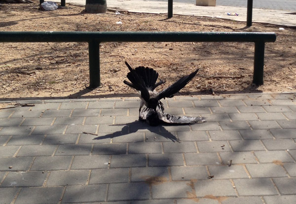 وهنا بعض الصور للحظة قتال بين غرابين في أحد شوارع مدينة يافا من تصوير: محمود عبيد.
