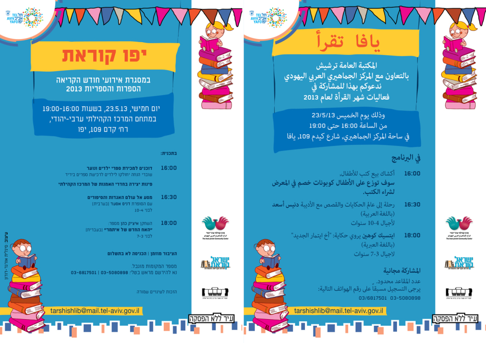 ينظم المركز الجماهيري وبالتعاون مع المكتبة العامة ترشيش فعاليات شهر القراءة لعام 2013 وذلك يوم الخميس 23-5-2013 في ساحة المركز الجماهيري الكائن بشارع كيدم 109 بيافا.