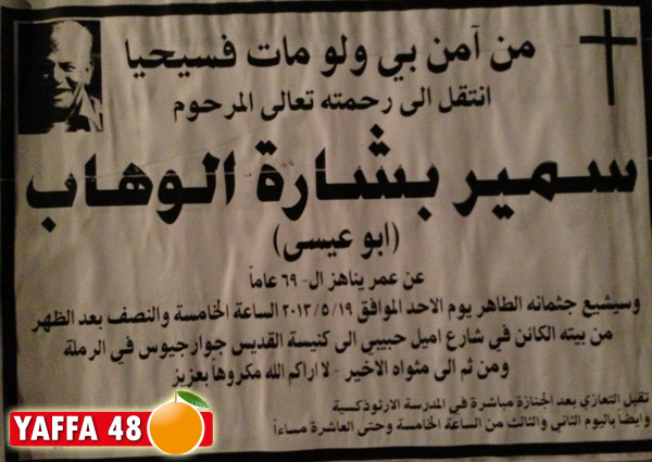 انتقل إلى رحمة الله تعالى السيد سمير بشارة الوهاب "أبو عيسى" عن عمر ناهز 69 عاماً، حيث سيتم تشييع جثمانه اليوم الأحد الساعة الخامسة والنصف بعد الظهر من بيته الكائن في شارع اميل حبيبي إلى كنيسة القديس جوارجيوس في مدينة الرملة.